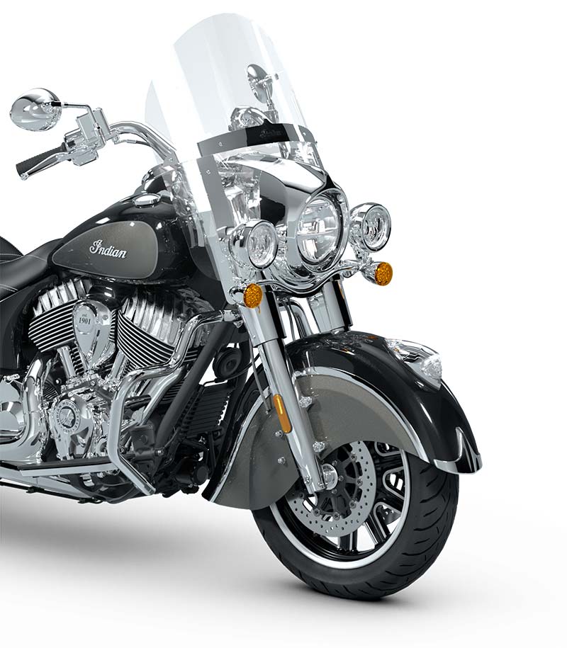 | Standard Equipment | Quick Release Windshield; Genuine Leather Seat; Remote-Locking Hard Saddlebags, Highway Bars; Tyre Pressure Monitoring; Light Bar; Selectable Ride Modes, ABS; Cruise Control; Keyless Ignition; Indian® Script Tank Badge; 12v Charging Port |